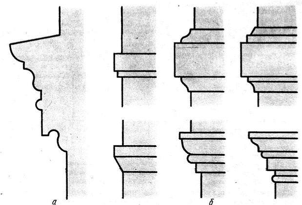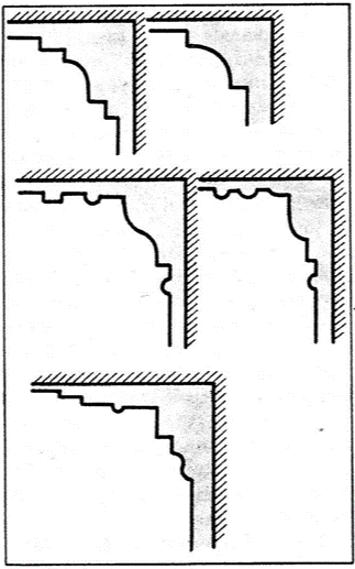 В зависимости от того, где расположены тяги, они имеют свои названия. Если по лузгу между стеной и потолком вытягивается какая-то тяга, то она называется внутренним карнизом, а в практике — просто карнизом. Формы и размеры карнизов бывают разные (рис. 116).
