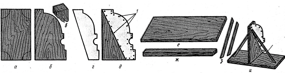 Изготовление шаблона. Шаблон состоит из профильной доски, салазок, подкосов и полозка. Профильная доска является основной частью шаблона. Ее изготовляют из прямослойной, несучковатой, остроганной сосновой или еловой доски. На профильную доску переносят контуры тяги, перекалывая или вычерчивая ее, после чего доску в нескольких местах надпиливают и скалывают ненужные части. Затем ножом вырезают по контуру профиль и срезают одну из сторон профильной доски «на лоск», то есть под углом 30...40°, а вторую оставляют «на сдир» — не срезают.
