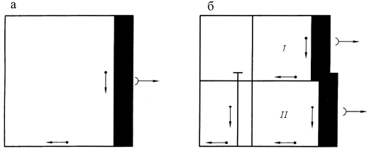 Рис. 42. Разновидности схем транспорта при сплошных системах разработки: а - транспортирование угля при одной лаве в этаже; б - транспортирование угля при делении этажа на подэтажи; I - первый подэтаж; II - второй подэтаж; стрелка с кружком - направление транспортирования угля