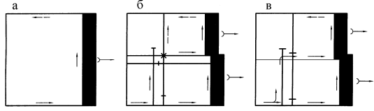 Рис. 43. Разновидности схем вентиляции при сплошных системах разработки: а, б - обособленное проветривание лав; в - последовательное проветривание лав с подсвежением струи