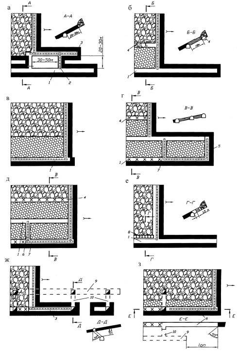 Рис. 45. Технологические схемы расположения и охраны транспортных штреков при сплошной системе разработки: а, б, в, г, д, е - по пласту с охраной их соответственно целиками угля, односторонней бутовой полосой с опережением забоя лавы и позади него, двусторонней бутовой полосой с опережением забоя лавы и позади него, БЖБТ (органной крепью, кострами, кустами, литыми полосами и др.); ж, з - по пустым породам (полевые) соответственно с опережением забоя лавы и позади него; 1 - транспортный пластовый штрек; 2 - сбойка; 3 - просек; 4 - бутовый штрек; 5 - раскоска; 6 - косовичник (если с подрывкой пород, то конвейерный штрек); 7 - косовичный ходок; 8 - БЖБТ; 9 - транспортный полевой штрек; 10 - скат