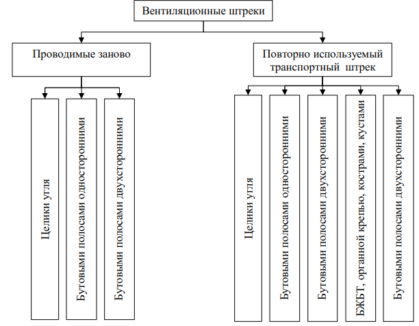 Повторное использование выработок и искусственные конструкции. Если в качестве вентиляционного используется бывший транспортный штрек, пройденный с охраной двусторонними бутовыми полосами, для соединения с лавой проводят вентиляционные косовичные ходки (рис. 47, е). Схема охраны штрека с помощью БЖБТ показана на рис. 47, ж. Хотя этот способ исключает трудоемкие работы с породой, его существенным недостатком являются трудности герметизации выработанного пространства. Это приводит к значительным утечкам воздуха и ухудшению проветривания верхней части лавы. При повторном использовании полевого штрека (рис. 47, з) проветривание организуют через вентиляционные гезенки.