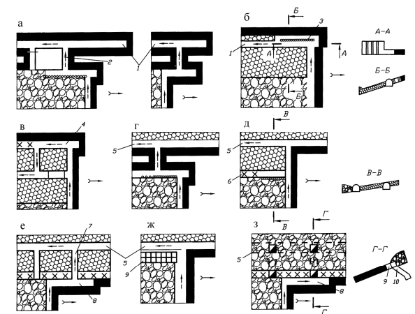 Рис. 47. Технологические схемы расположения и охраны вентиляционных штреков при сплошной системе разработки: а, б, в - с проведением штреков заново и охраной их соответственно целиками угля, бутовой полосой односторонней, бутовой полосой двусторонней; г, д, е, ж, з - с повторным использованием бывших транспортных штреков и охраной их соответственно целиками угля, бутовой полосой односторонней, бутовой полосой двусторонней, БЖБТ (органной крепью, кустами, кострами), массивом пород; 1 - вентиляционный штрек, проводимый заново; 2 - вентиляционная сбойка; 3 - запасный выход из лавы; 4 - косовичник; 5 - бывший транспортный штрек, используемый в качестве вентиляционного; 6 - бутовый штрек; 7 - вентиляционный косовичный ходок в закладке; 8 - просек; 9 - БЖВТ; 10 - скат