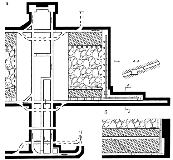 Организация вентиляционных штреков. Вентиляционные штреки в большинстве случаев проводят по завалу и охраняют целиками угля (рис. 54, а) или бутовыми полосами (рис. 54, б). Проведение штреков по завалу на месте бывших откаточных – трудоемкий процесс, осуществляемый отбойными молотками из-за наличия в старых выработках остатков крепи и крупных глыб пород. Эта мера часто вызвана необходимостью сохранить одинаковый уровень рельсовых путей на всем вентиляционном горизонте. Охрана небольшими целиками угля применяется для обеспечения безопасного и надежного сопряжения лавы со штреком, особенно когда породы кровли нарушены ведением вышележащих работ.