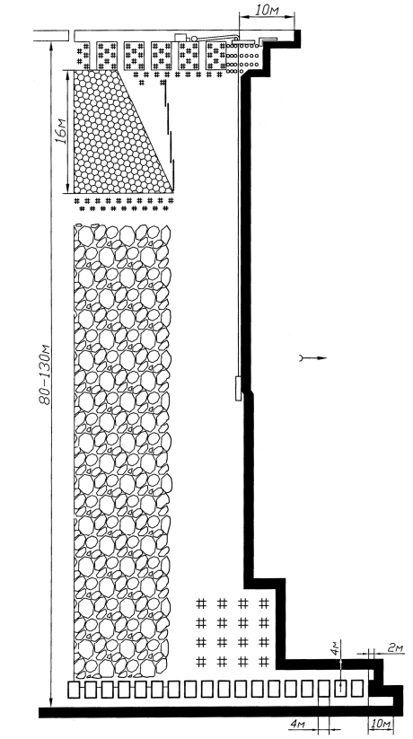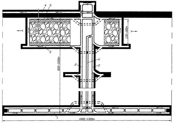 Применение полевых штреков. Проведение штреков по пустым породам (полевых штреков) (рис. 53, г) применяется на пластах, склонных к самовозгоранию, опасных по выбросам, а также со слабыми боковыми породами. Полевые штреки располагают в почве пласта на расстоянии 5–20 метров от него. Соединение штрека с лавой осуществляется через гезенки (скаты), которые проводят либо буровзрывным способом, либо с помощью буросбоечных машин. При машинном способе диаметр гезенков достигает 1 метра, а расстояние между ними принимается в пределах 5–8 метров для оптимизации затрат и трудоемкости работ.