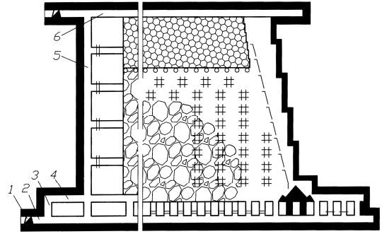 Рис. 51. Сплошная система разработки на тонких крутых пластах лава-этаж с потолкоуступочной формой забоя: 1 - этажный квершлаг; 2 - этажный откаточный штрек; 3 - печь; 4 - просек; 5 - вентиляционная печь; 6 - этажный вентиляционный штрек