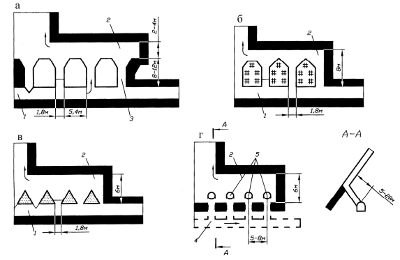 Рис. 53. Технологические схемы расположения и охраны откаточных штреков при сплошной системе разработки крутых пластов: а, б, в - по пласту с охраной соответственно целиками угля, кострами, кустами; г - по пустым породам; 1 - пластовый откаточный штрек; 2 - просек; 3 - углеспускная печь; 4 - полевой откаточный штрек; 5 - гезенки (скаты)