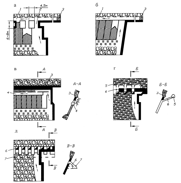 Рис. 54. Технологические схемы расположения и охраны вентиляционных штреков при сплошной системе разработки крутых пластов: а, б - по завалу; в - по пласту; г, д - по пустым породам соответственно с проведением нового штрека и повторным использованием бывшего транспортного; 1 - вентиляционный штрек, проводимый по завалу; 2 - вентиляционная печь; 3 - бывший откаточный штрек; 4 - вентиляционный штрек, проводимый по пласту (минусовый штрек); 5 - полевой вентиляционный штрек, проводимый заново; 6 - вентиляционный гезенк (сбойка); 7 - полевой вентиляционный штрек, повторно используемый (бывший откаточный)