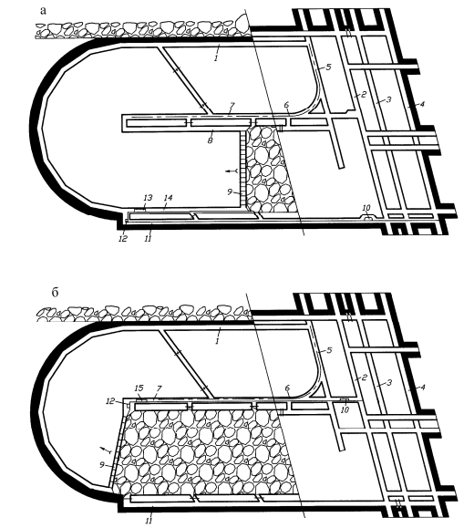 Рис. 82. Выкопировки из плана горных работ по пласту 7 - 7адо (а) и во время (б) разворота комплекса КМ 130: 1, 8, 11 - вентиляционные штреки; 2, 3, 4, 5 - соответственно конвейерный, людской, западный и восточный путевые уклоны; 6 - рельсовый путь; 7, 14 - конвейерные штреки; 9 - лава, оборудованная комплексом 4KMI30; 10 - телескопический ленточный конвейер 1ЛТ80; 12 - скребковый конвейер 1СР70М; 13, 15 - соответственно перегружатели 1ЛТП и ПТК1