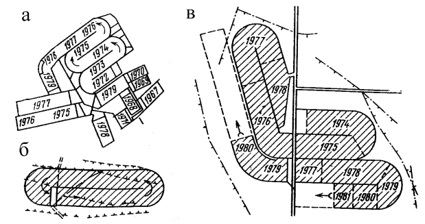 На шахте «Вестфален» (рис. 83, в) была отработана сложная схема с множественными геологическими нарушениями. Четыре выемочных столба общей длиной 3400 метров были пройдены одной лавой за счет неоднократного разворота. Срок непрерывной эксплуатации механизированного комплекса без демонтажа составил около пяти лет, что подтвердило высокую эффективность метода.